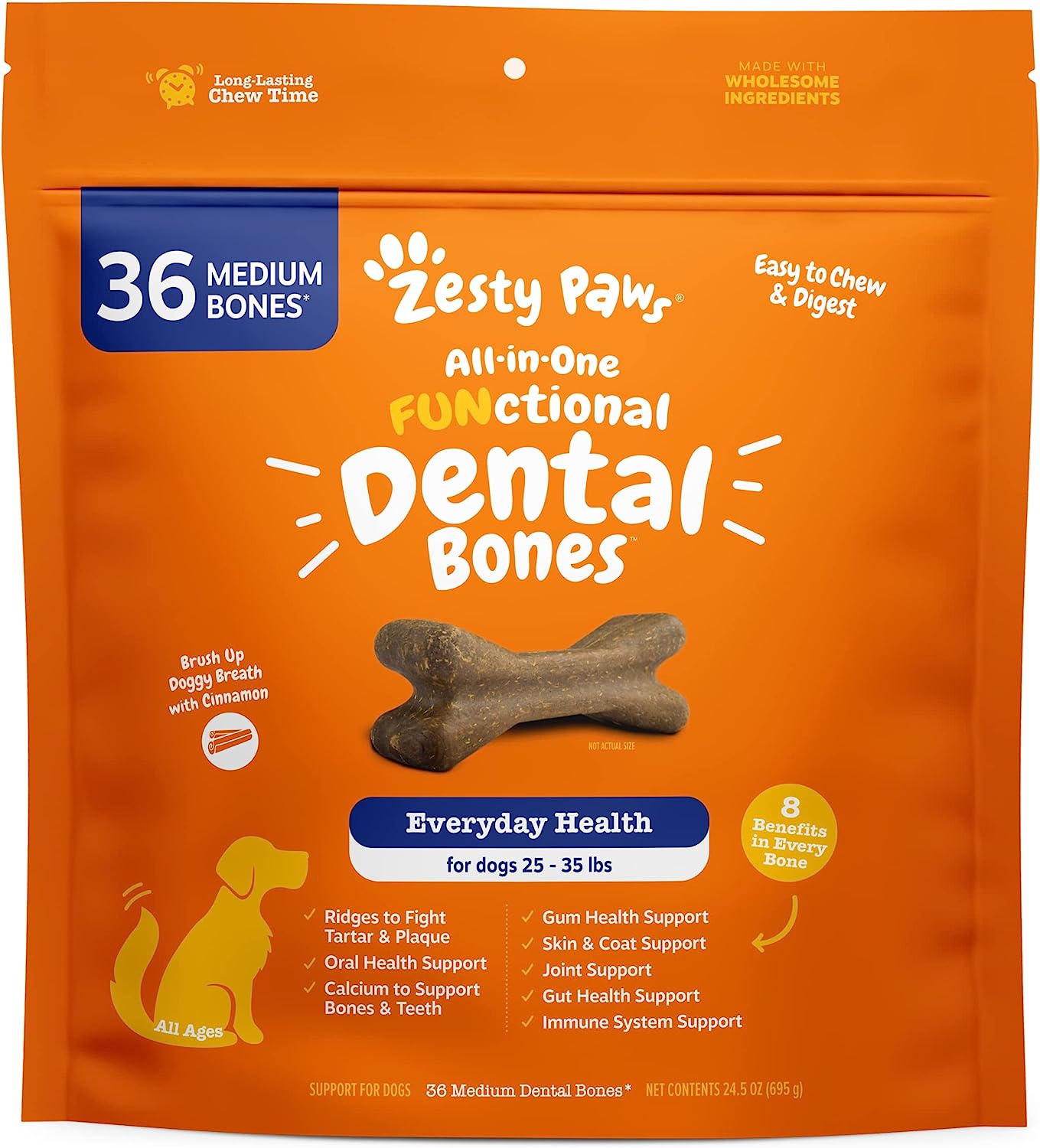 As a dog parent, it’s only natural that you’d want to support Fido’s chompers to give them a boost of Zest. But why stop at just a basic breath freshener that can’t do a deep clean for your dog’s teeth? Instead of starting off small, go big with these All-in-One FUNctional Dental Bones! Oral health and fresh breath are just the beginning of what these bones can do!